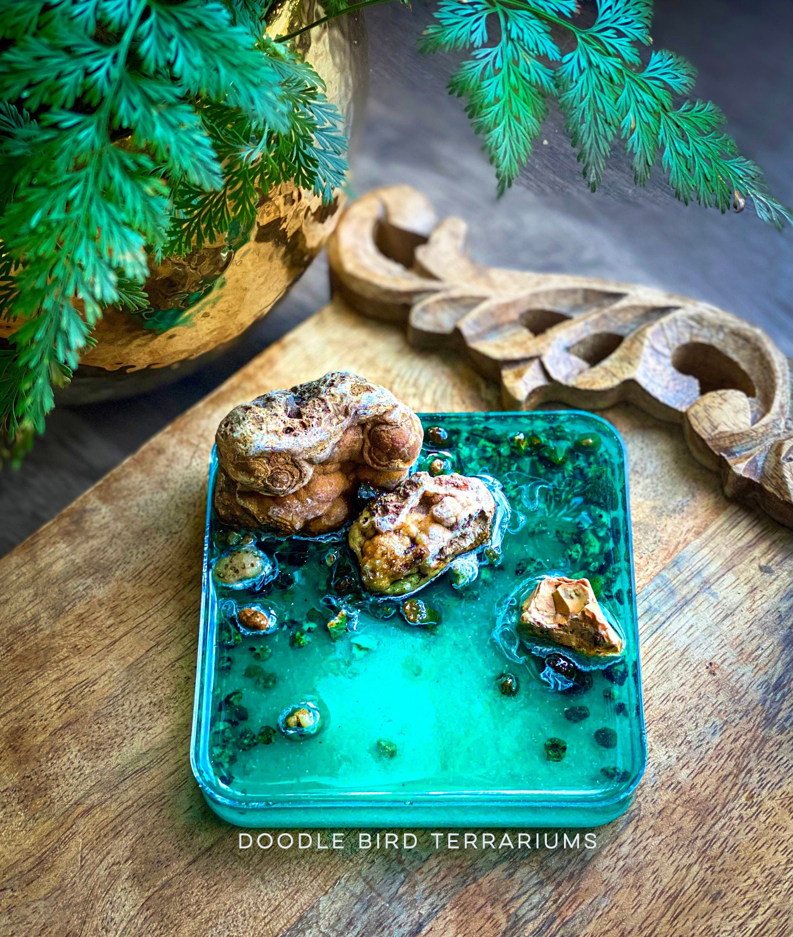 Terrariums are packaged with great care. Packing material is used both inside and outside the jar so that the contents are not jumbled around during shipping. Any terrarium containing live plants should be unpacked immediately after arrival. Plants cannot survive long periods of time inside the box or with packing material covering them. If you need to keep the terrarium in the box then place it in the refrigerator until needed. This will keep the plant fresh (simulating winter conditions) and green. Remember to remove the packing material prior to storage.