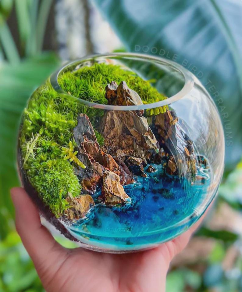 Mini Blue Lagoon Terrarium with Live Moss for Decorative Accents