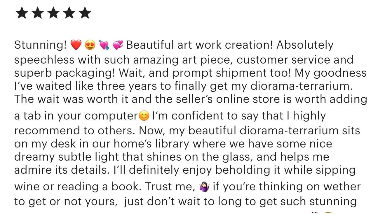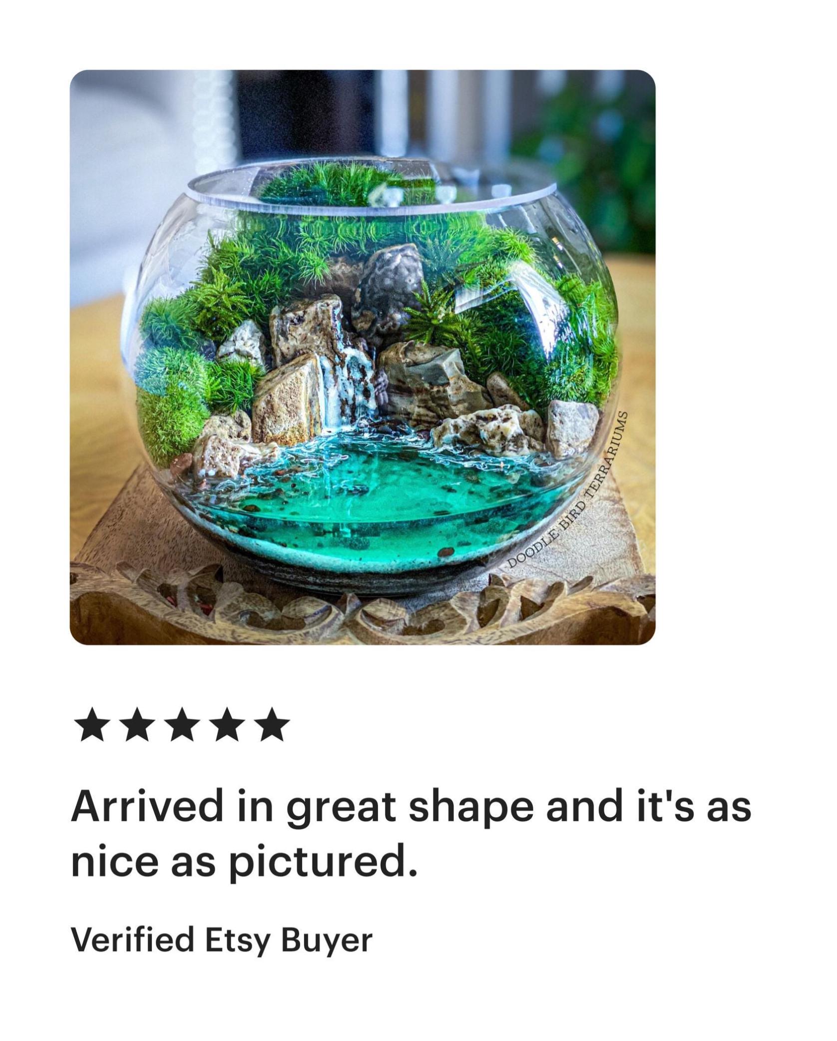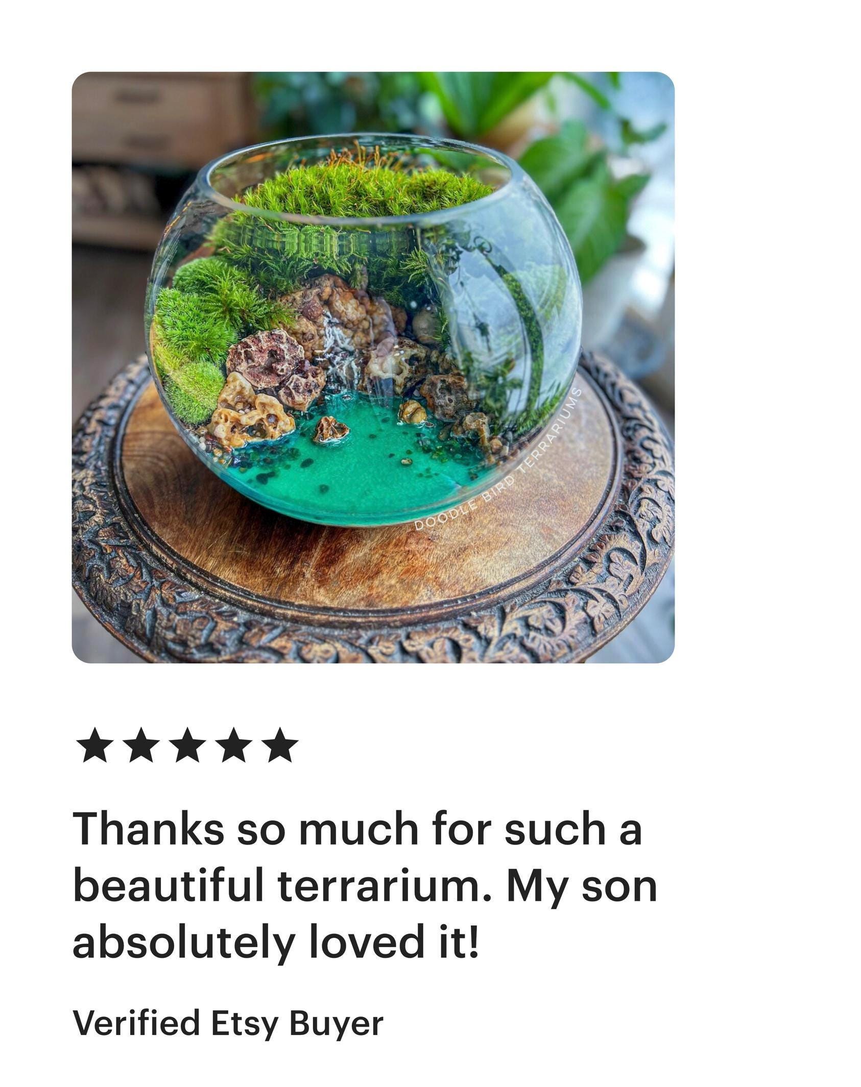Terrariums are packaged with great care. Packing material is used both inside and outside the jar so that the contents are not jumbled around during shipping. Any terrarium containing live plants should be unpacked immediately after arrival. Plants cannot survive long periods of time inside the box or with packing material covering them. If you need to keep the terrarium in the box then place it in the refrigerator until needed. This will keep the plant fresh (simulating winter conditions) and green. Remember to remove the packing material prior to storage.