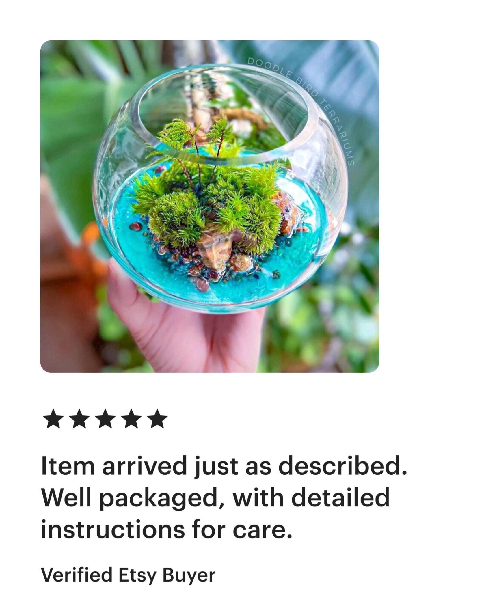 Terrariums are packaged with great care. Packing material is used both inside and outside the jar so that the contents are not jumbled around during shipping. Any terrarium containing live plants should be unpacked immediately after arrival. Plants cannot survive long periods of time inside the box or with packing material covering them. If you need to keep the terrarium in the box then place it in the refrigerator until needed. This will keep the plant fresh (simulating winter conditions) and green. Remember to remove the packing material prior to storage.