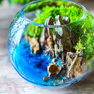 Now you can enjoy a Summer ocean oasis anytime of the year! This terrarium features lush green foliage surrounding turquoise waters made of a transparent, richly tinted resin which is solid to the touch. Each piece is painstakingly created by hand using real stone and will therefore be unique yet similar to the photos. Please allow for extra time as these pieces are made to order and need several days of curing. Details below: