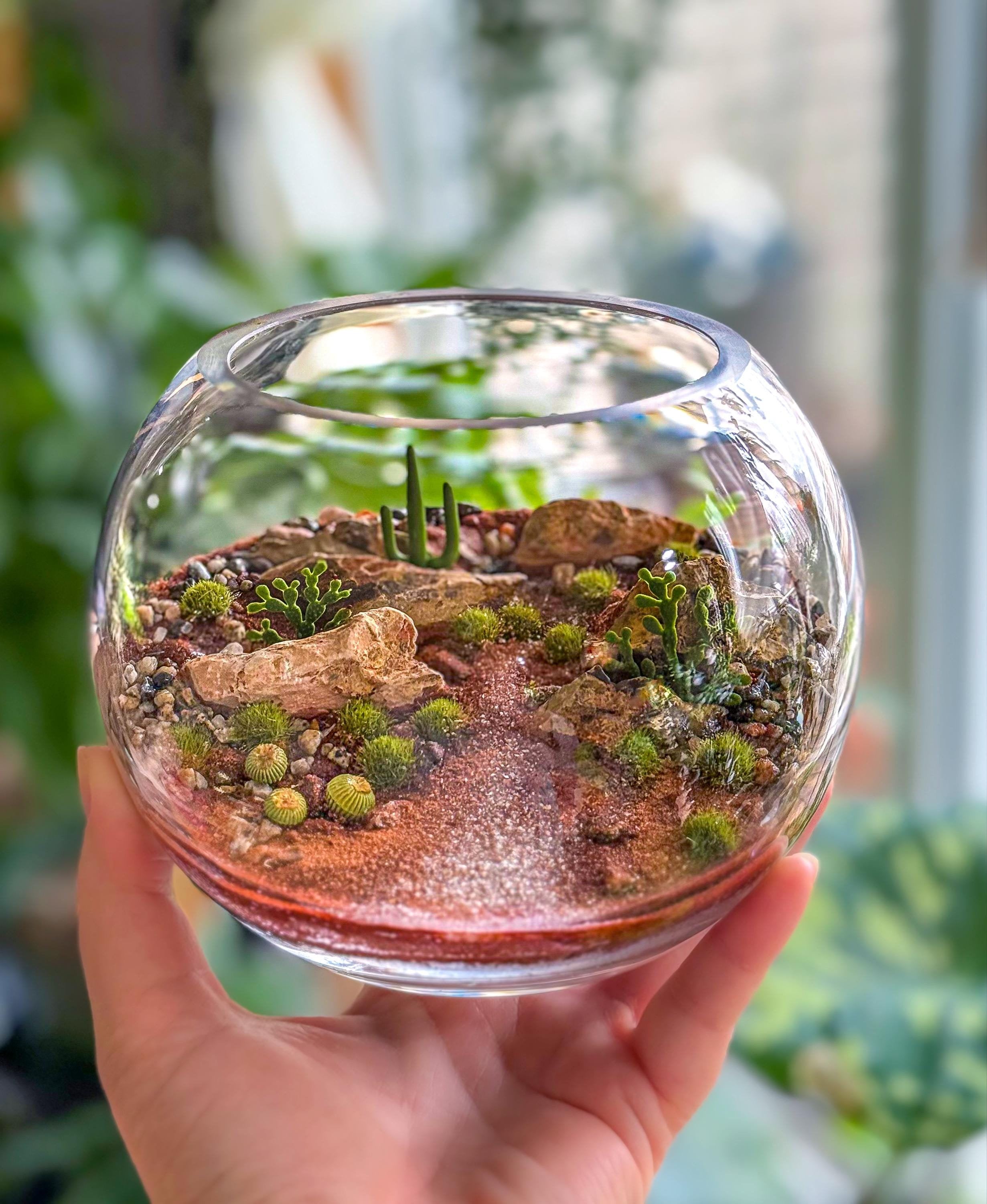Terrariums are packaged with great care keeping safety in mind. Because of that reason, gift wrapping is not an option. However, a personalized gift card is available upon request and is free of charge.