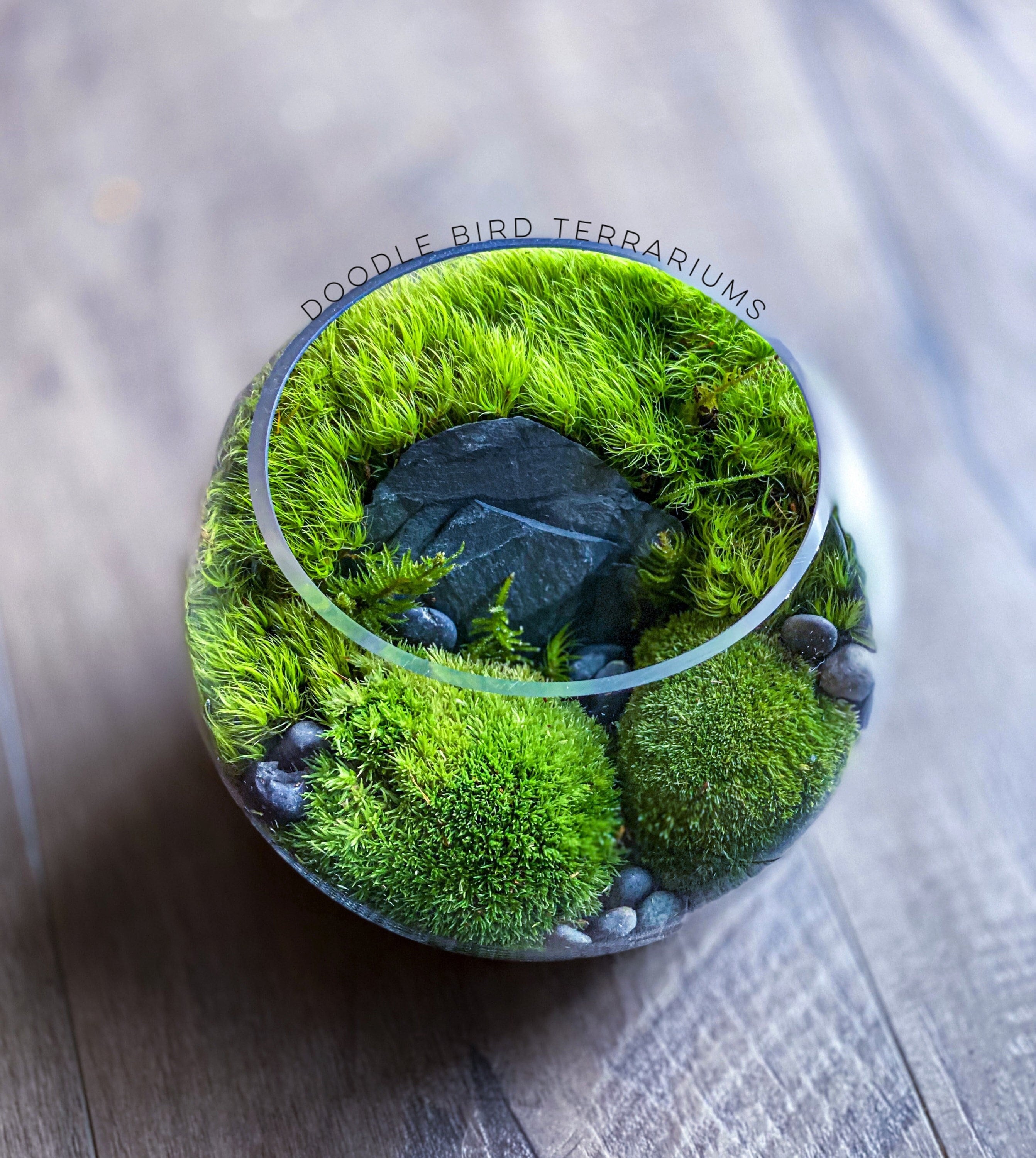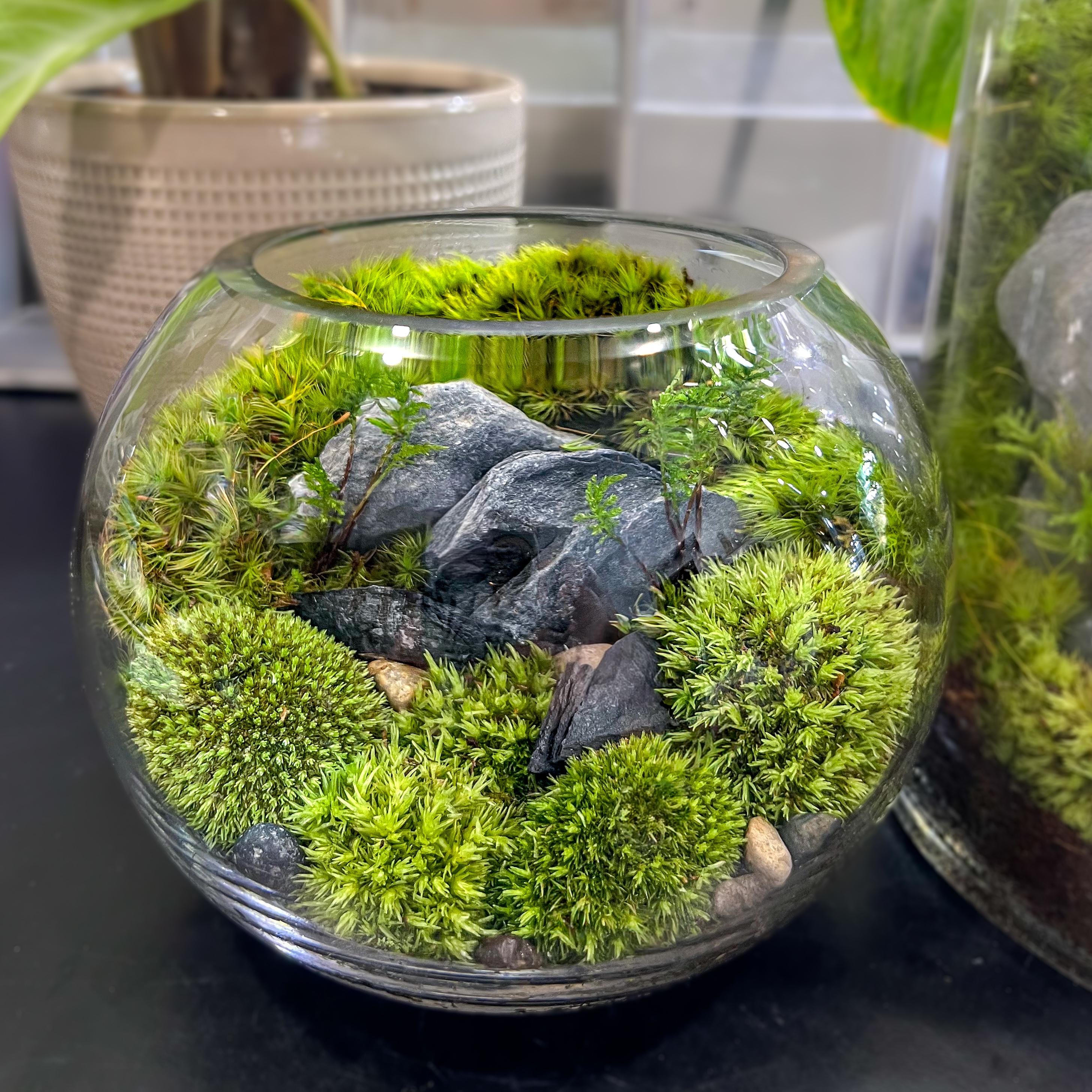 Terrariums are packaged with great care. Packing material is used both inside and outside the jar so that the contents are not jumbled around during shipping. Any terrarium containing live plants should be unpacked immediately after arrival. Plants cannot survive long periods of time inside the box or with packing material covering them. If you need to keep the terrarium in the box then place it in the refrigerator until needed. This will keep the plant fresh (simulating winter conditions) and green. Remember to remove the packing material prior to storage.