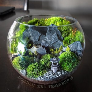 Terrariums are packaged with great care. Packing material is used both inside and outside the jar so that the contents are not jumbled around during shipping. Any terrarium containing live plants should be unpacked immediately after arrival. Plants cannot survive long periods of time inside the box or with packing material covering them. If you need to keep the terrarium in the box then place it in the refrigerator until needed. This will keep the plant fresh (simulating winter conditions) and green. Remember to remove the packing material prior to storage.