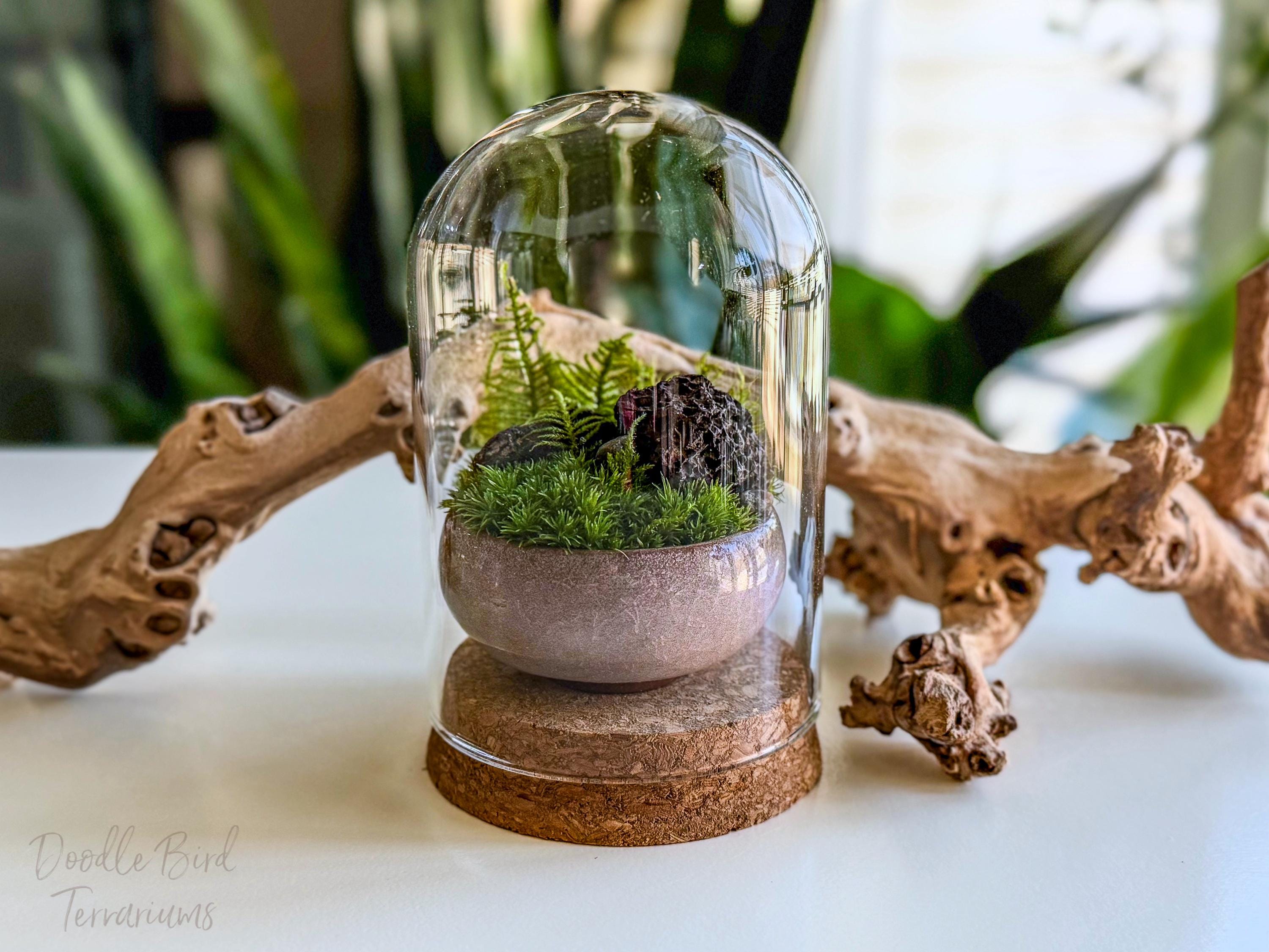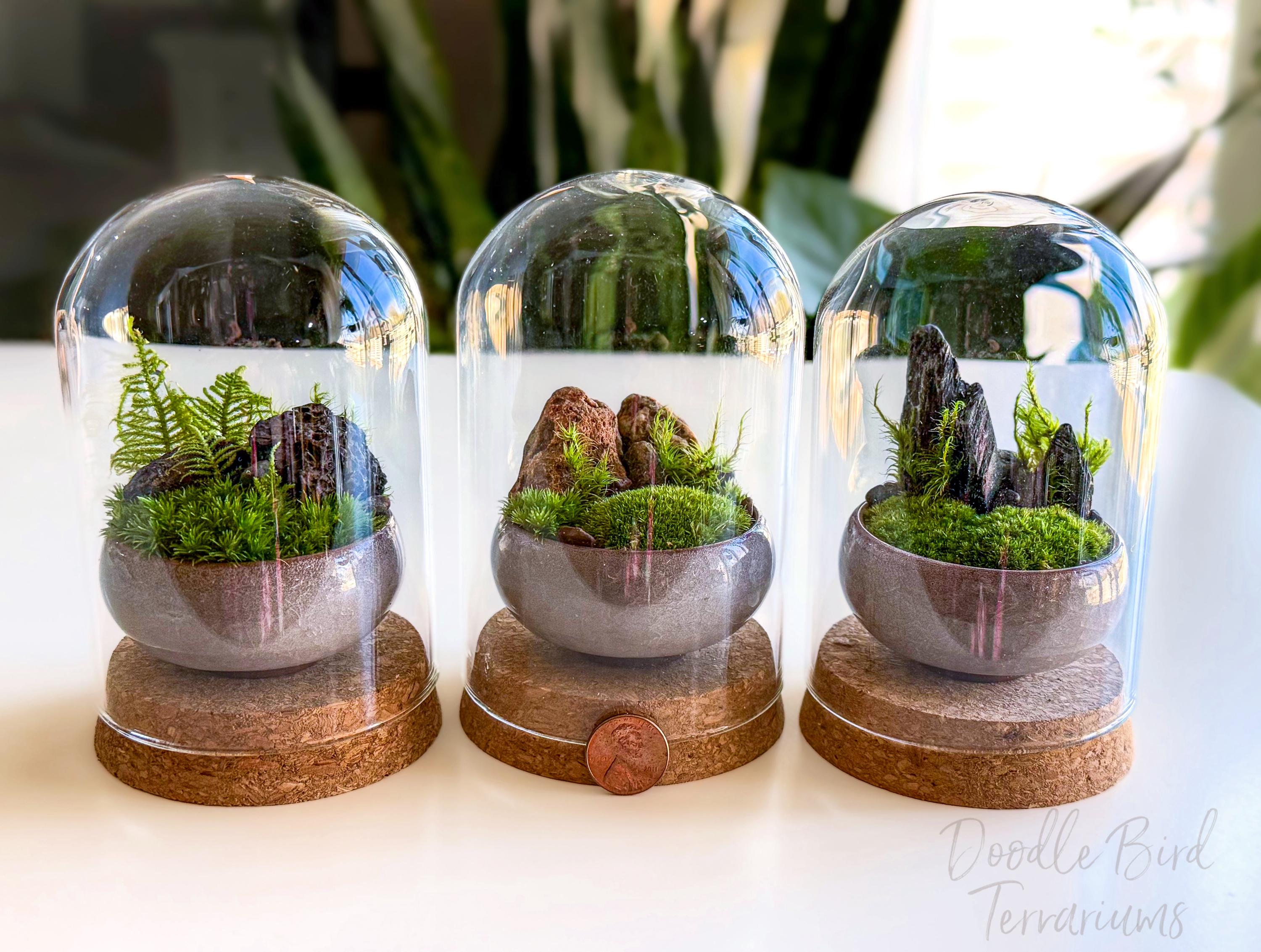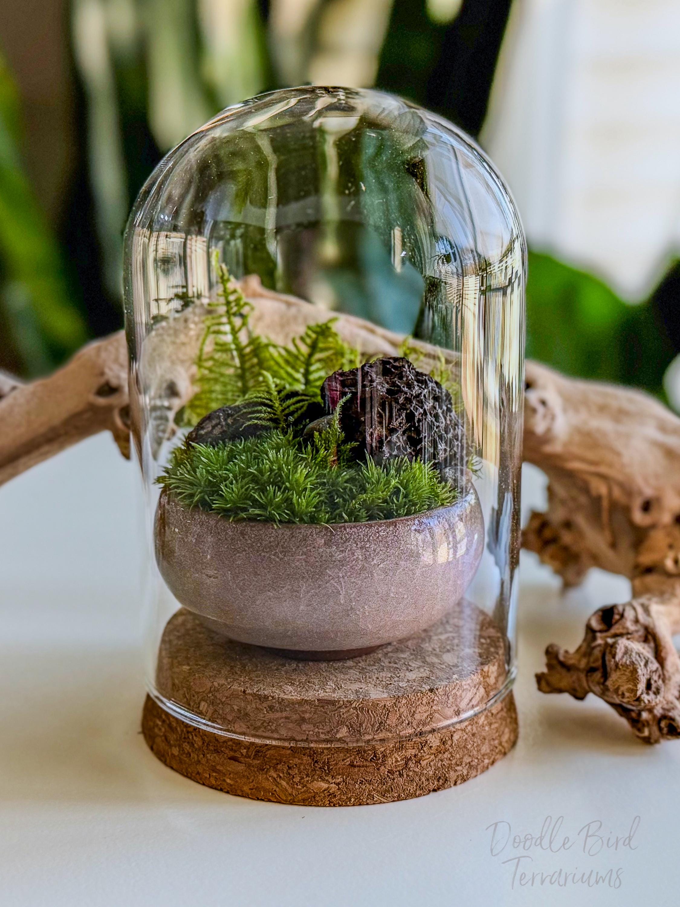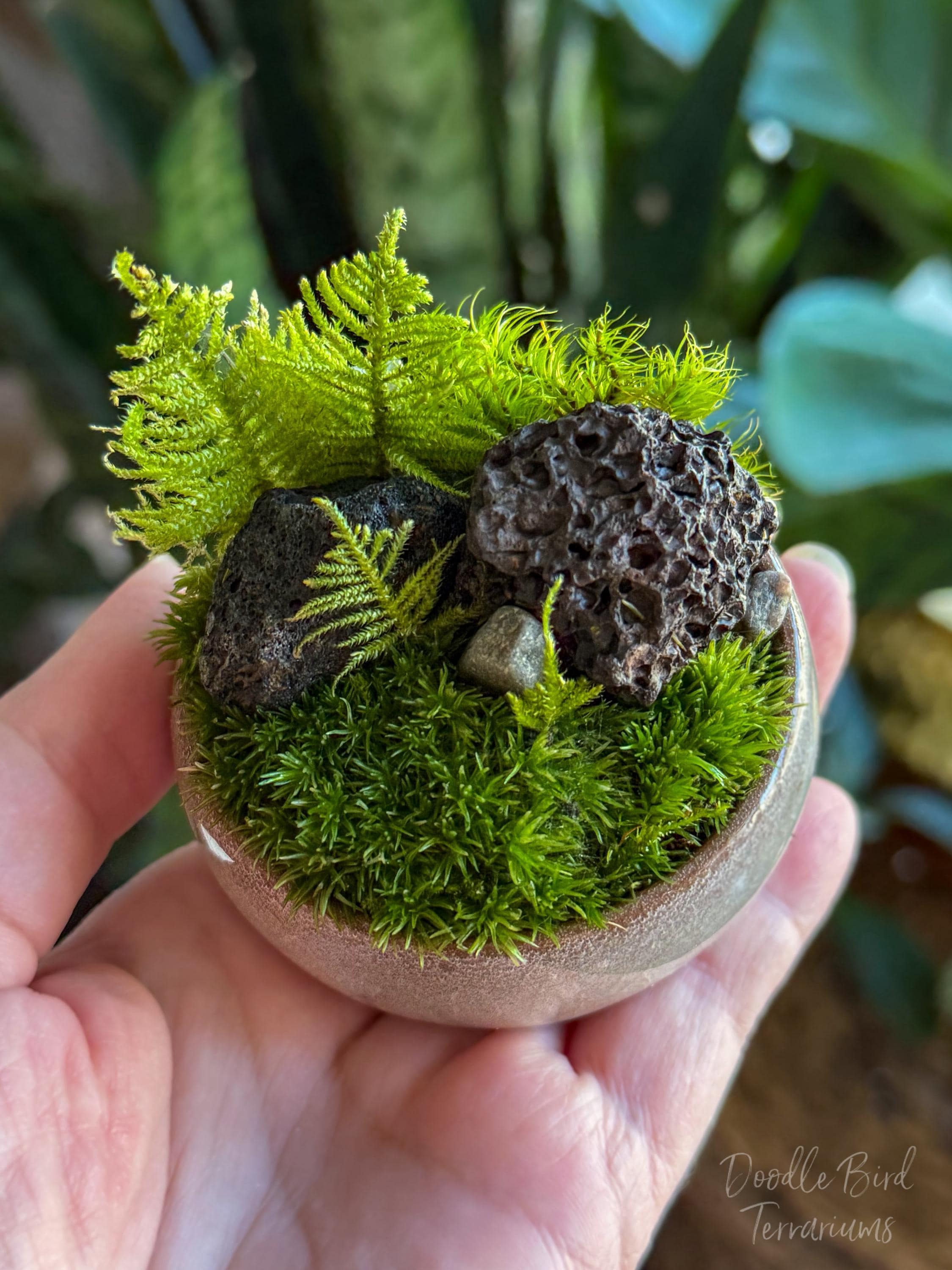 Moss is wonderfully low maintenance. Place your terrarium in bright indirect light or under a grow lamp and keep the moss lightly moist. Mist with distilled water when the moss begins to dry.