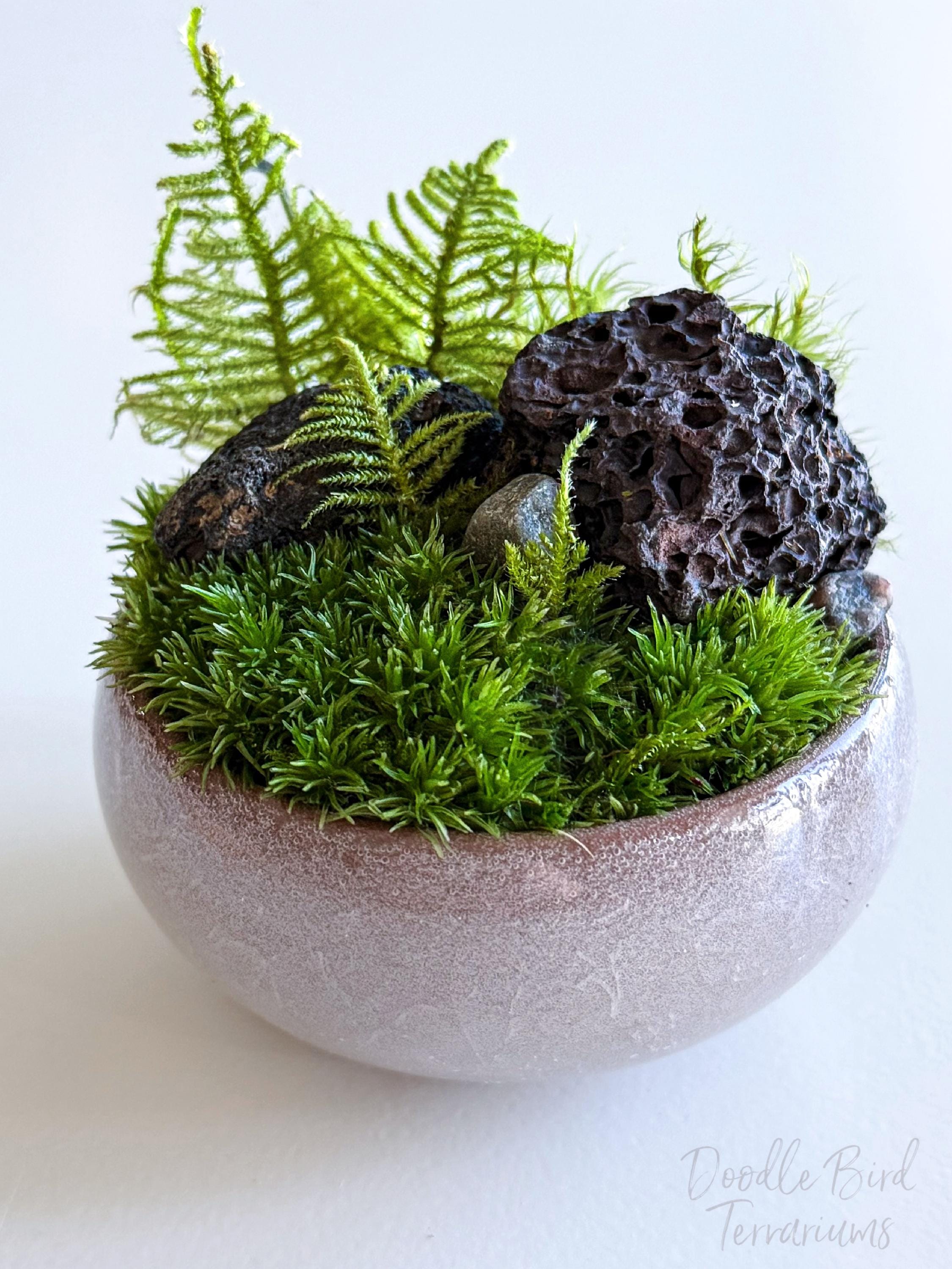 A small study in natural materials. This little dish garden brings together rugged, porous stone and layered live cushion moss, accented with fern moss for subtle height and detail. The composition is intentionally minimal, drawing attention to texture and balance. A glass dome is available as an add-on and is recommended to maintain proper humidity. This piece must be kept within a terrarium environment to thrive.