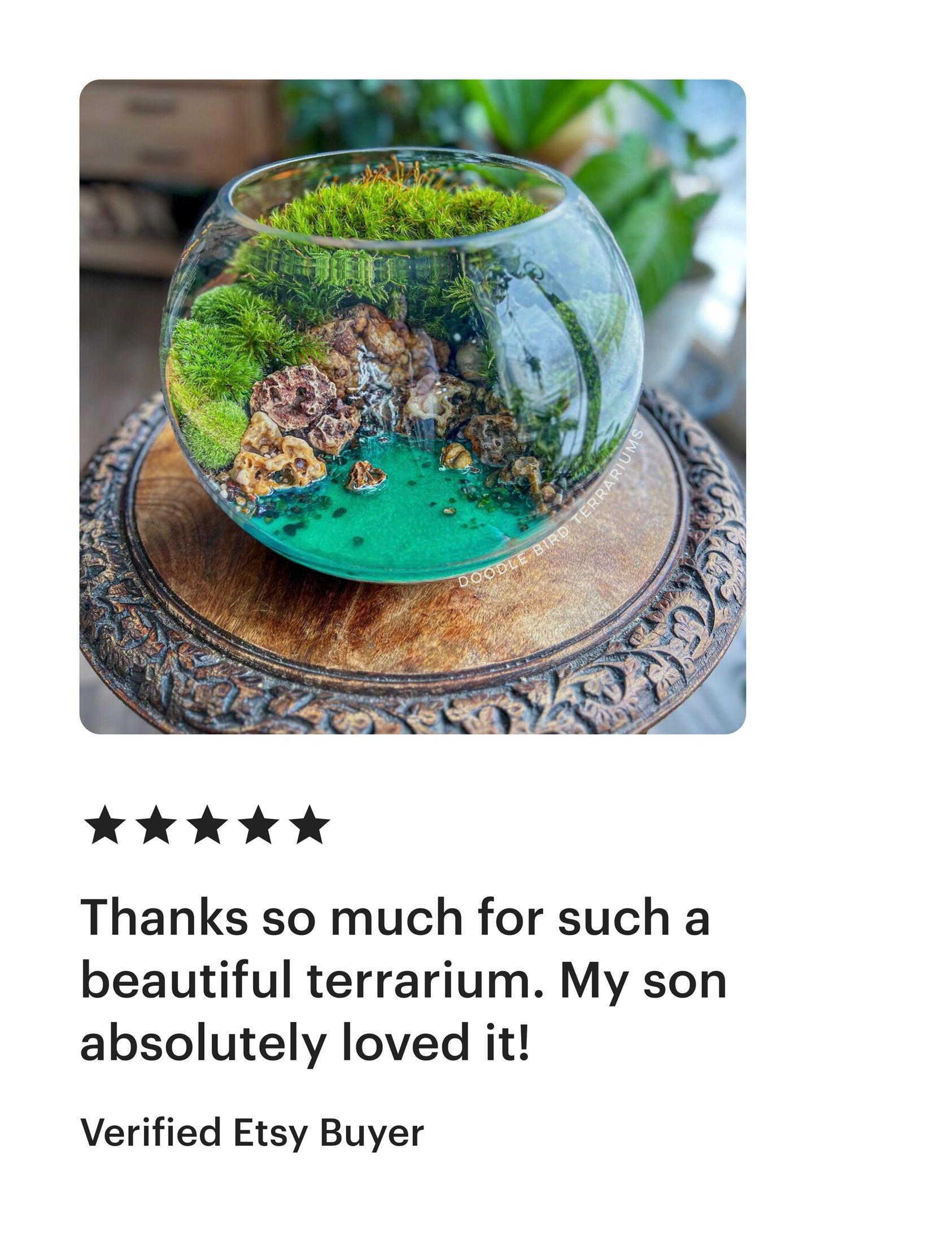 Terrariums are packaged with great care. Packing material is used both inside and outside the jar so that the contents are not jumbled around during shipping. Any terrarium containing live plants should be unpacked immediately after arrival. Plants cannot survive long periods of time inside the box or with packing material covering them. If you need to keep the terrarium in the box then place it in the refrigerator until needed. This will keep the plant fresh (simulating winter conditions) and green. Remember to remove the packing material prior to storage.